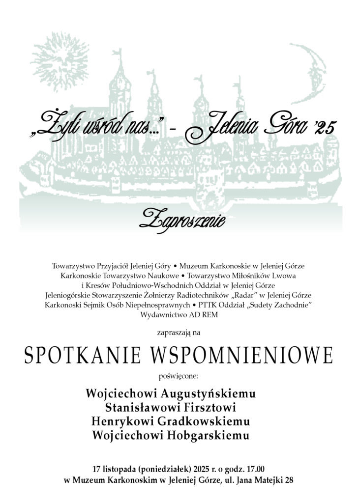 Odeszli, lecz pozostali w pamięci Jeleniej Góry… Serdecznie zapraszamy 17 listopada o godz. 17:00 na wieczór wspomnień o osobach zasłużonych dla naszego miasta i regionu, którzy odeszli w 2025 roku. ✟ Stanisław Firszt – dyrektor Muzeum Karkonoskiego w Jeleniej Górze, dyrektor Muzeum Przyrodniczego w Jeleniej Górze, muzealnik, archeolog, menadżer kultury, społecznik.✟ Wojciech Augustyński – współzałożyciel […]