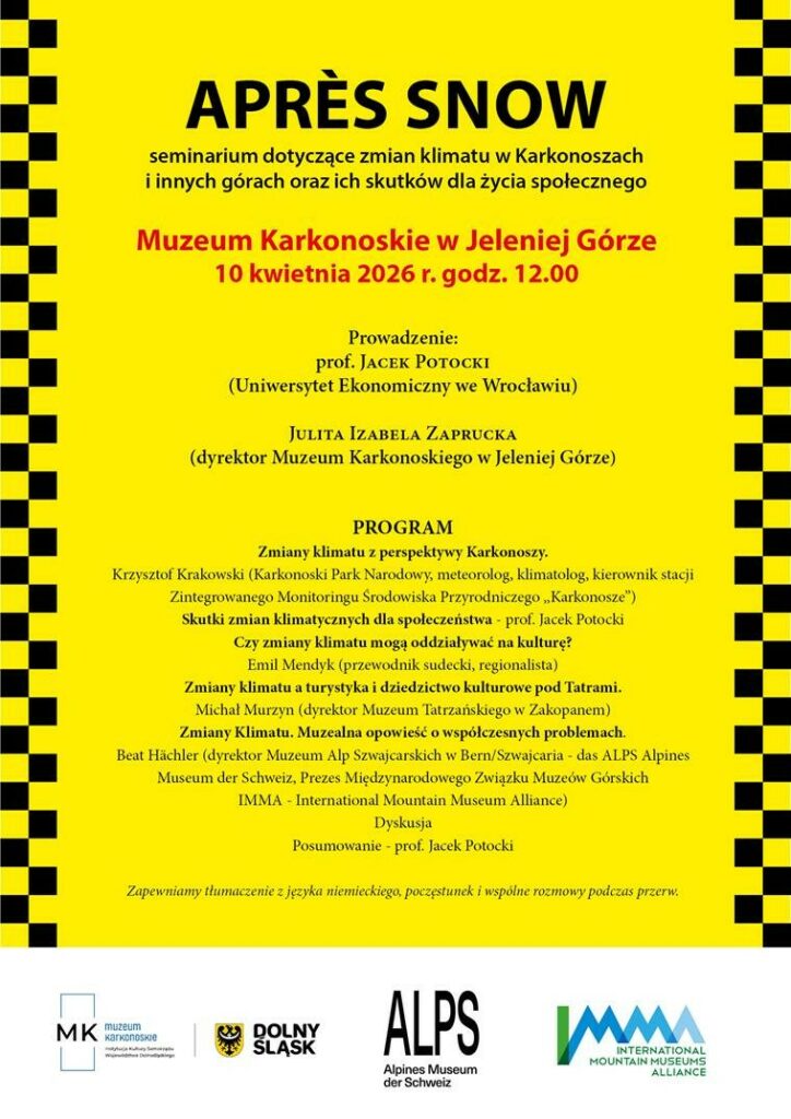 10 kwietnia 2026 o godz. 12:00 serdecznie zapraszamy na seminarium Après Snow, dotyczące zmian klimatu w Karkonoszach i innych górach oraz ich skutków dla życia społecznego.